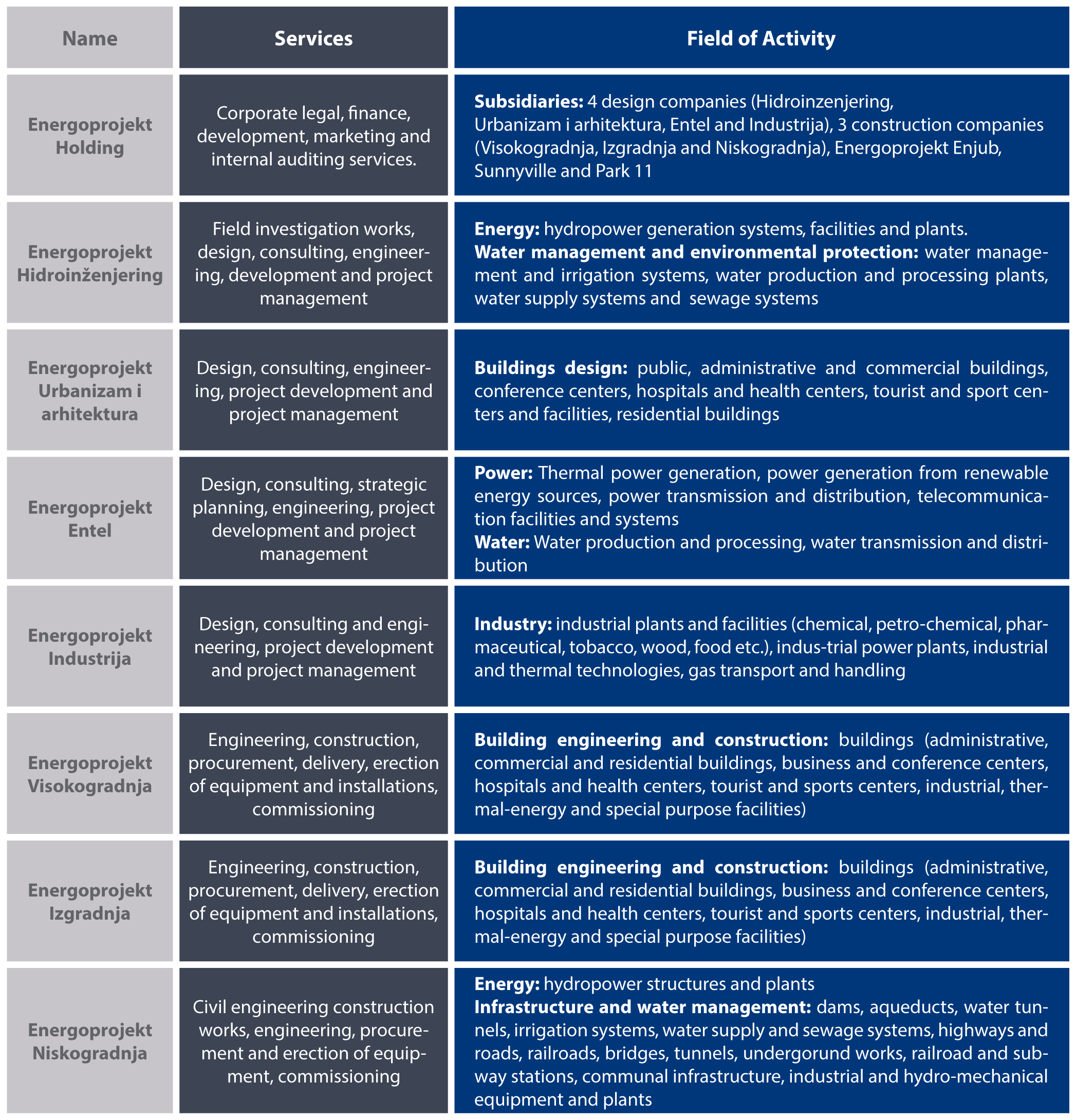 Founded in 1951 in Belgrade, as a state owned company to provide design and consultancy services within hydro and thermal power generation and water management, through its 75 years of business operations, ENERGOPROJEKT has evolved into a complex business entity, integrating Energoprojekt Holding (parent company) and 7 subsidiaries with its headquarters in Serbia and 15 foreign companies, representative and branch offices abroad.
